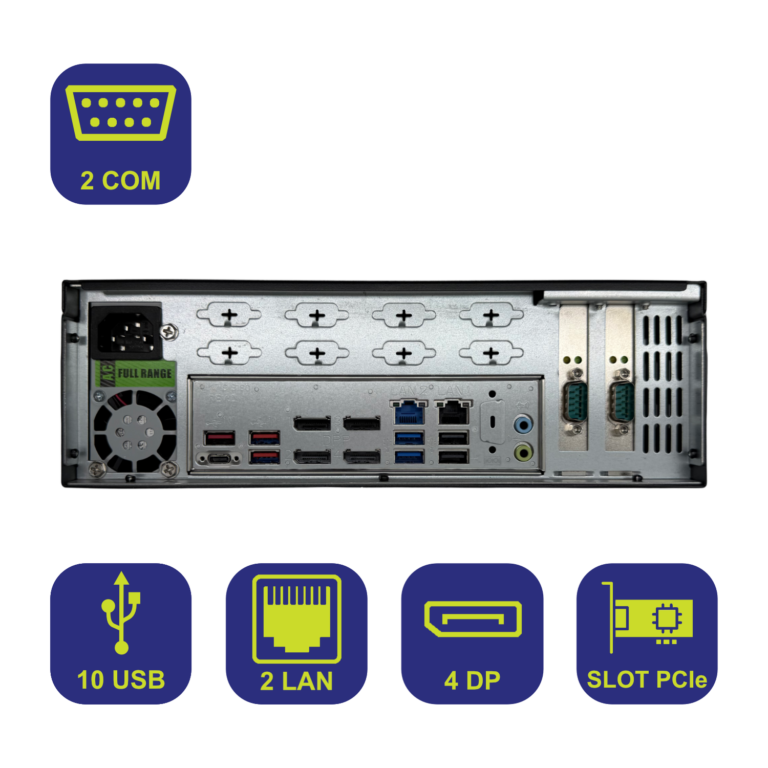 PC Industriale Personalizzato con CPU Intel Core i5/i7, 2 porte LAN GbE, 4 uscite DisplayPort, 2 porte COM e slot PCIe espandibili. Soluzione versatile per applicazioni industriali avanzate.
